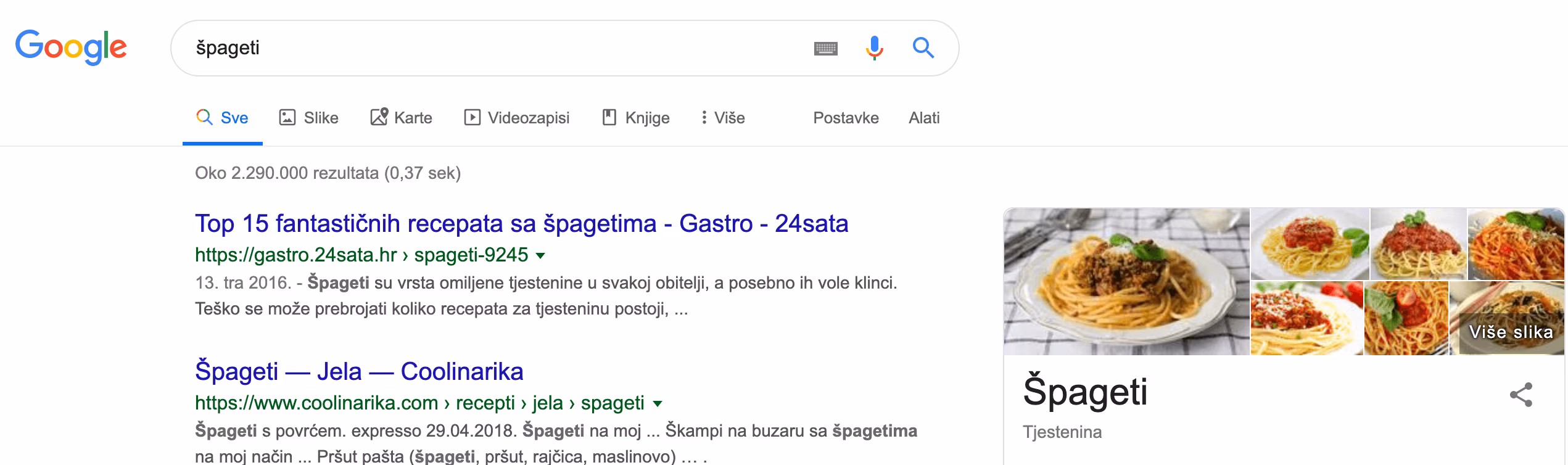 Primjerice, bliži se vrijeme večere i Vama se jedu špageti. Nakon što ste upisali riječ “špageti” Google Vam je dao nekoliko desetina stranica o špagetima i receptima.